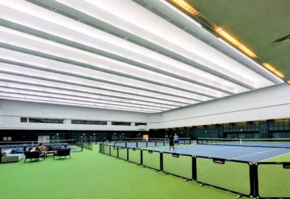 In a wacky real estate turn of events, the former New York Mercantile Exchange “pit” on the third floor of 300 Vesey, or One North End Avenue, is now a tennis facility — Hudson River Tennis Club — and has four courts and a gym, lounge and kitchen to come. It’s a 55,000-square-foot space, and while they could not fill me in on the lease arrangement, it looks pretty permanent.