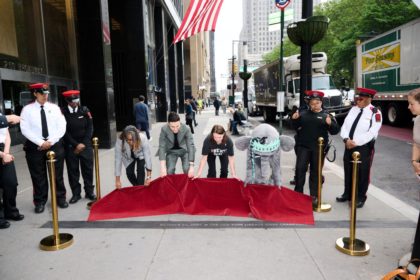 The Downtown Alliance permanently commemorated the ticker tape parade honoring the New York Liberty’s 2024 WNBA championship by unveiling a granite plaque in front of 250 Broadway (Park Place and Murray) last week. From left to right is Keia Clarke, CEO of the Liberty, Jonathan Kolb, general manager, Jessica Lappin, president of the Downtown Alliance, and of course Ellie the Elephant. Last year’s parade for the Liberty was the first for a New York City sports championship since the Giants were honored in 2012. And it was the first time a women’s sports team from New York has been given a parade. It was the 209th ticker tape parade in New York history.