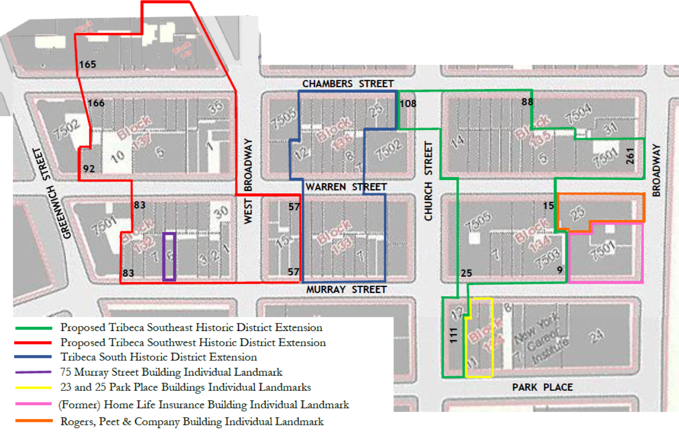I only learned recently that historic preservationists attempted this spring to extend the Tribeca West Historic District down the block in an attempt to preserve several beauties: 1 Hudson Street, 90 West Broadway and 80 West Broadway (aka 68-72 Warren Street) — see the red outline in the map below. But their request was denied in May by the city’s Landmarks Commission “due to a lack of consistent historic character, integrity, and cohesion with nearby designated blocks.”