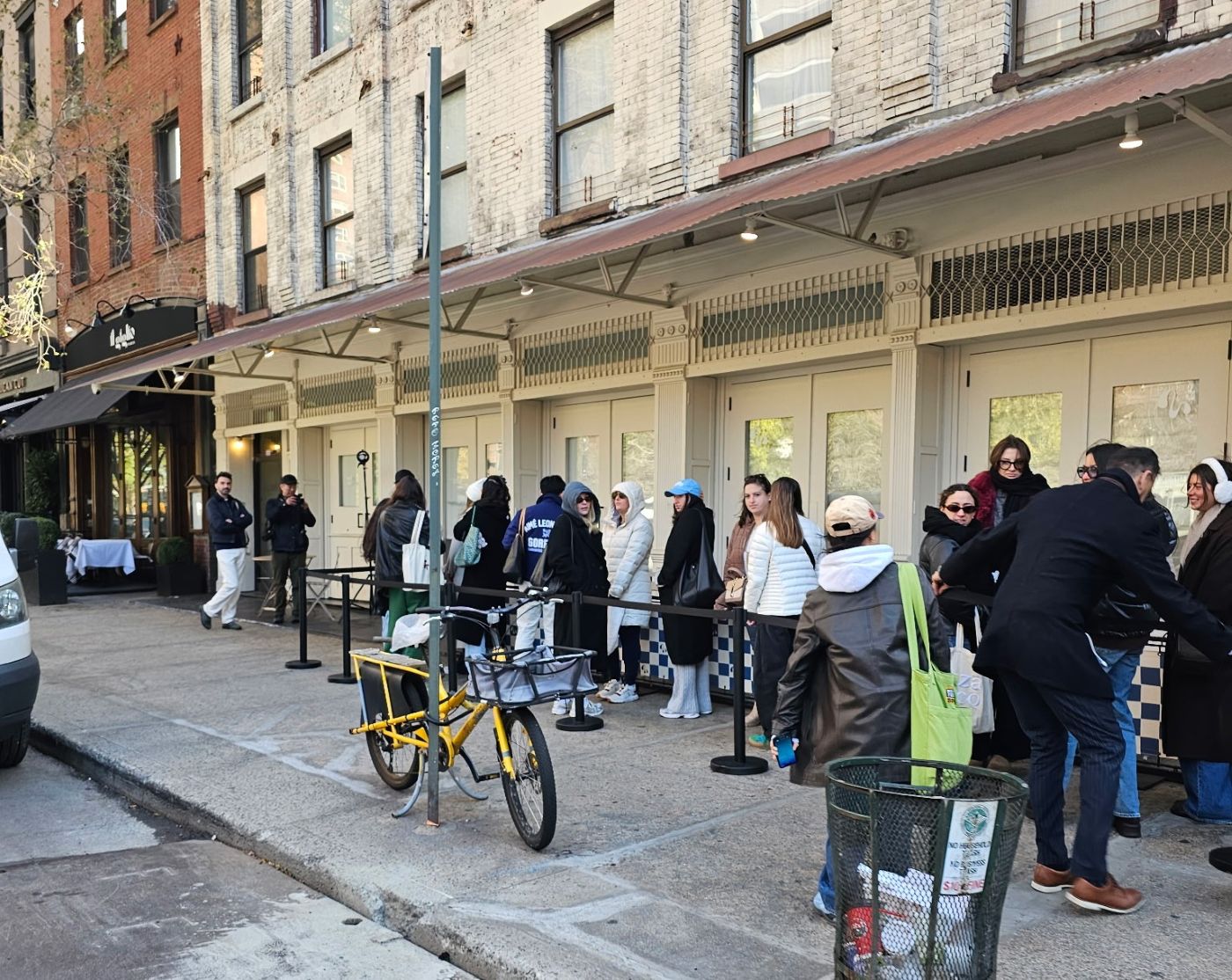 Meadow Lane, the gourmet prepared food market and florist that has been under construction in the former Harrison space since May 2024, opened Friday at 355 Greenwich — and throngs of folks have been waiting for hours to get in. The store hours were originally posted as 11a to 9p, but they abbreviated those and closed altogether yesterday — day 4 — to give their staff a break. (Thanks to G., J. and G. for the shots.)