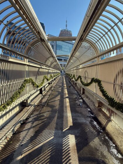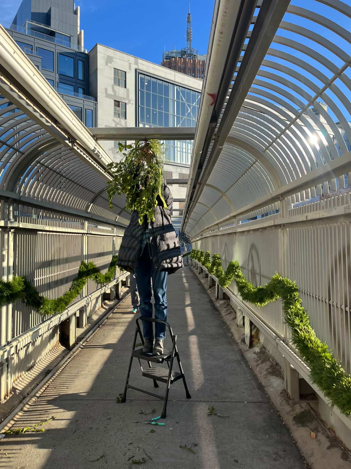 What a treat! Fox Fodder Flowers, the floral design studio that moved from Williamsburg to Vestry in June, decorated the Laight Street pedestrian bridge for the holidays on Friday. They dubbed it the “Kissing Bridge” for the cluster of mistletoe hung from the girders and added the roping down the sides. “Happy smooching,” their IG post read.