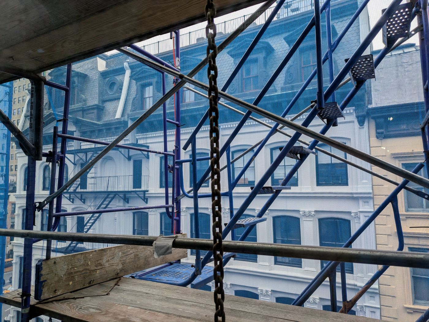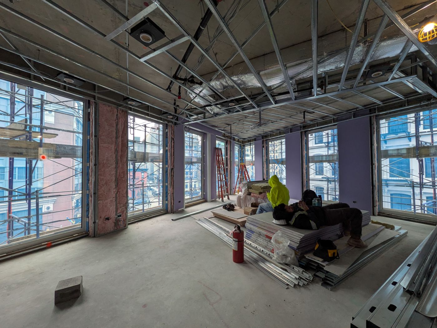 Another day, another hardhat tour — this time with one of the developers of the new 14 White, Frank LePera, and the architect-of-record, Alexander Loyer Hughes of KURV Architecture. (That’s them, below, on the terrace of the penthouse.) As a reminder, this was an empty lot that once had a JR mural on the lot-line wall of 12 White. Together, the development partners are Parametric Development Corporation; partner David Ruff’s architectural firm, NAVA, did the interior layouts and design.