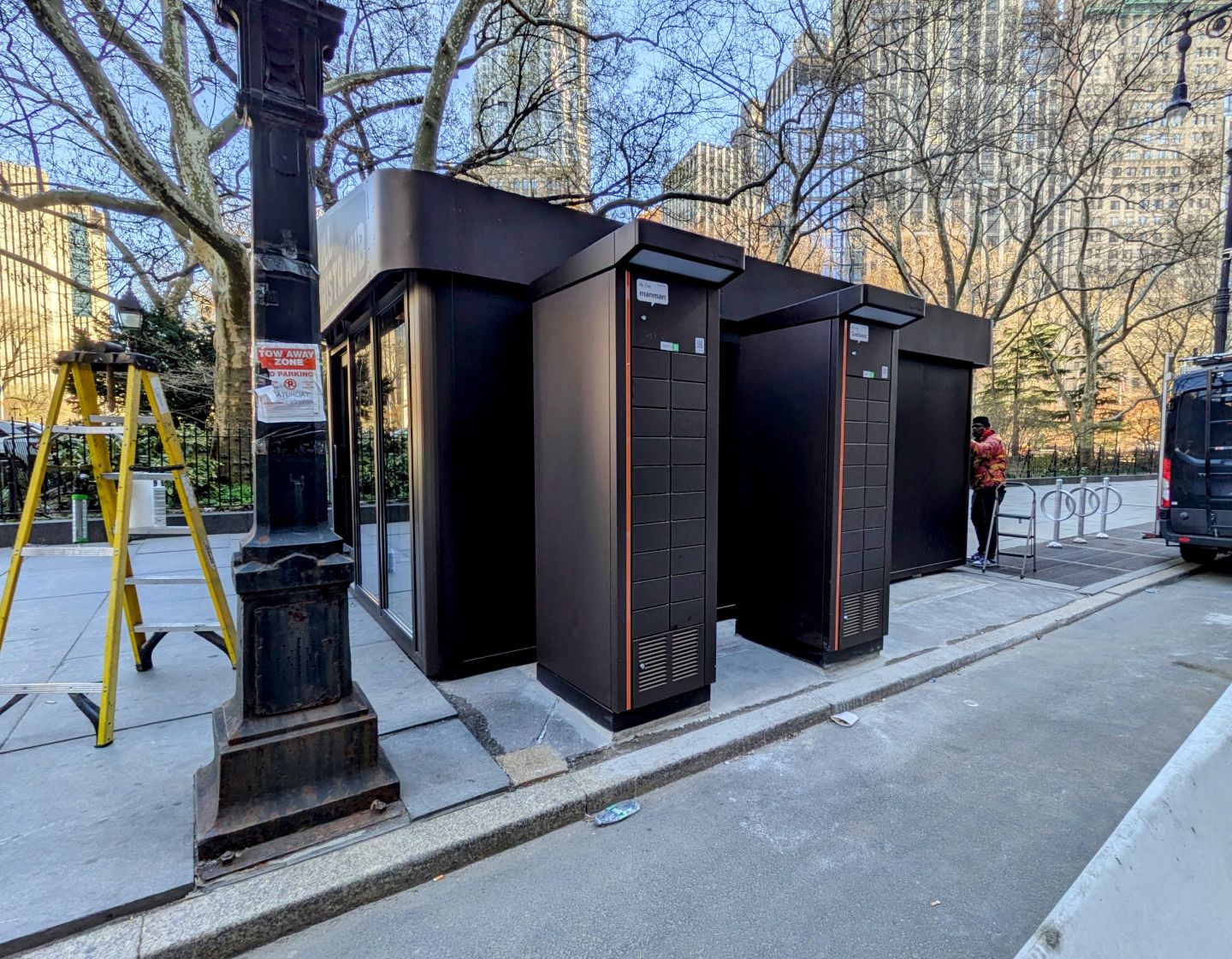 The hub, designed by Brooklyn-based urban design firm Fantástica, includes two exterior charging cabinets, each with 19 charging cubbies, with 24-hour public access. E-bike riders can drop off their battery and track its progress via a mobile app, which will also unlock the cubby once the battery is ready for pickup. (A section of the street has been protected for this process by a Jersey barrier.)